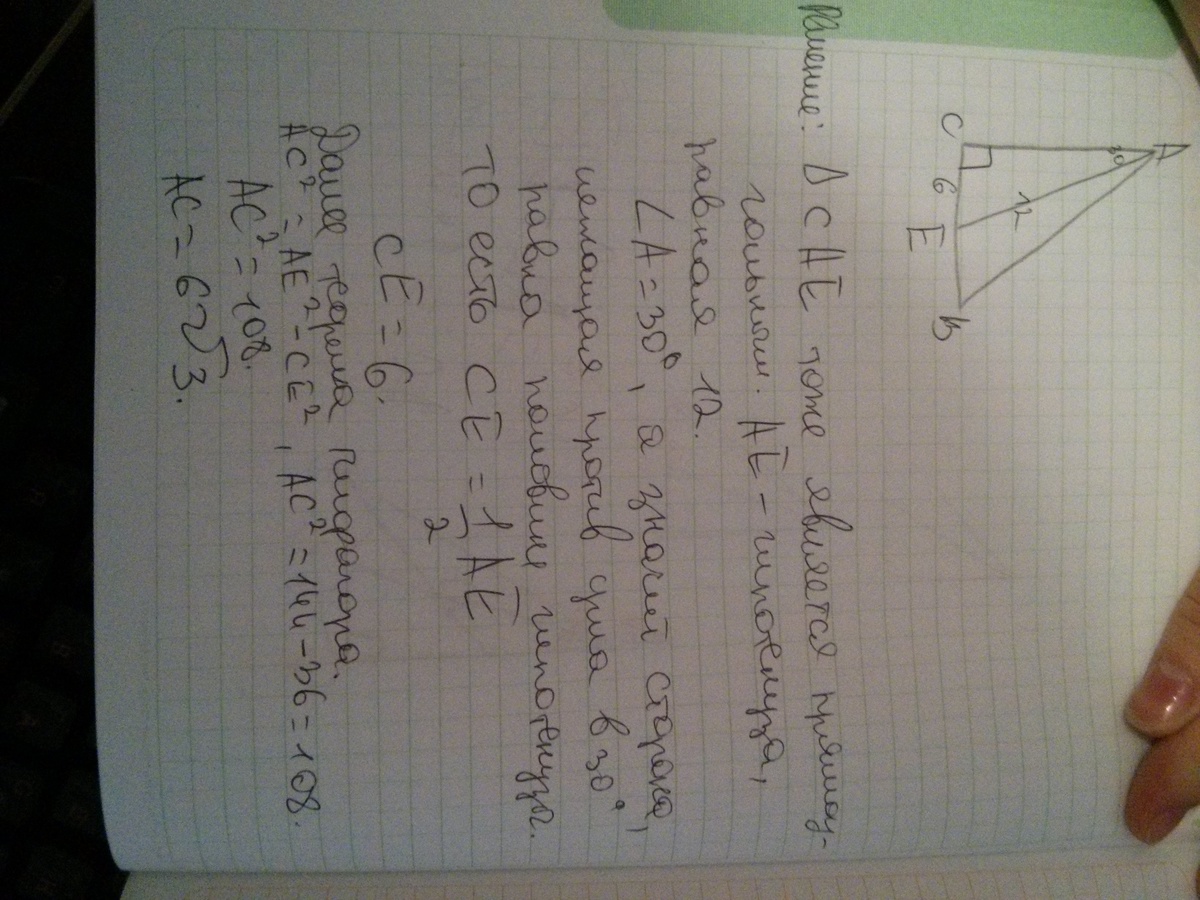 В прямоугольном треугольнике биссектриса острого угла с градусной мерой 60 градусов равно 12 см Найдите больший катет данного треугольника