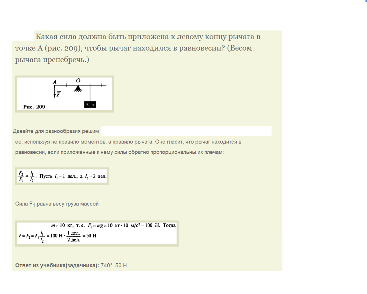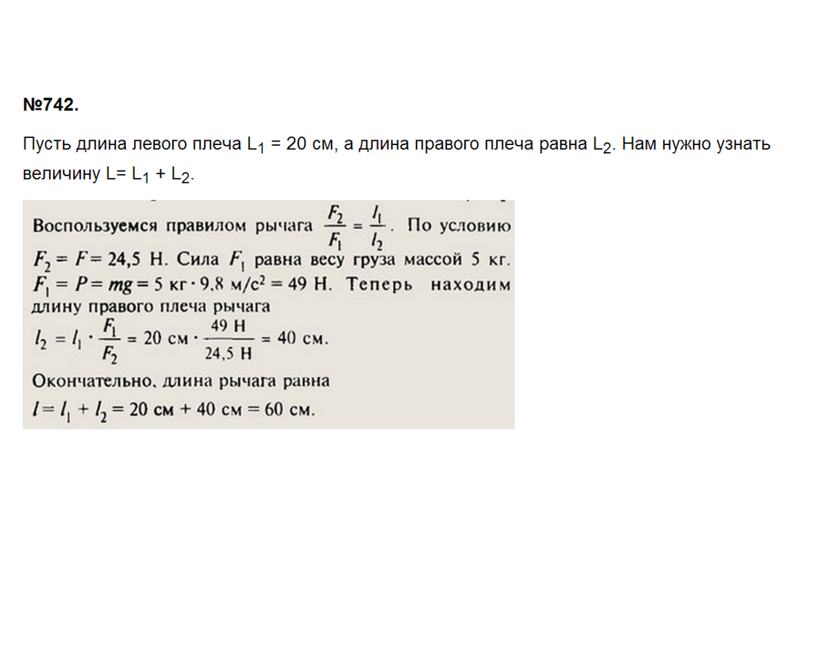 Пусть длина левого плеча l1=20см, а длина правого плеча равна l2. Нам нужно узнать величину l=l1+l2. Воспользуемся правилом рычага F2/F1=l1/l2. По условию F2=F=24,5 H. Сила F1 равна весу груза массой 5 кг. F1=P=mg=5кг*9.8 м/c^2=49 H. Теперь находим длину правого плеча рычага l2=l1* F2/F1 = 20 см * 49H/24,5H= 40 см. Окончательно, длина рычага равна l=l1+l2=20см+40см=60см.