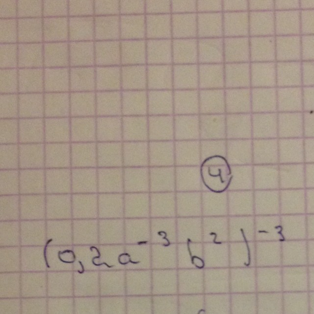 (0,2•а^(-3)•b^2)^(-3) = (1/5)^(-3)•(а^(-3))^(-3)•(b^2)^(-3) = 5^3•a^9•b^(-6) = 125a^9b^(-6).