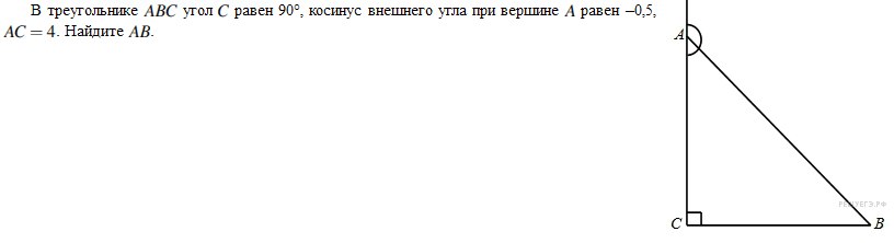 В треугольнике АВС угол С равен 90*, косинус внешнего угла при вершине А равен -0,5, АС равен 4, найдите АВ
