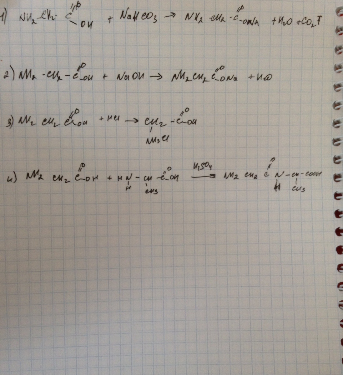 Составить уравнения реакций, характеризующих химические свойства глицина ( 2-аминоэтановая кислота ) (по 2 реакции по каждой функциональной группе).