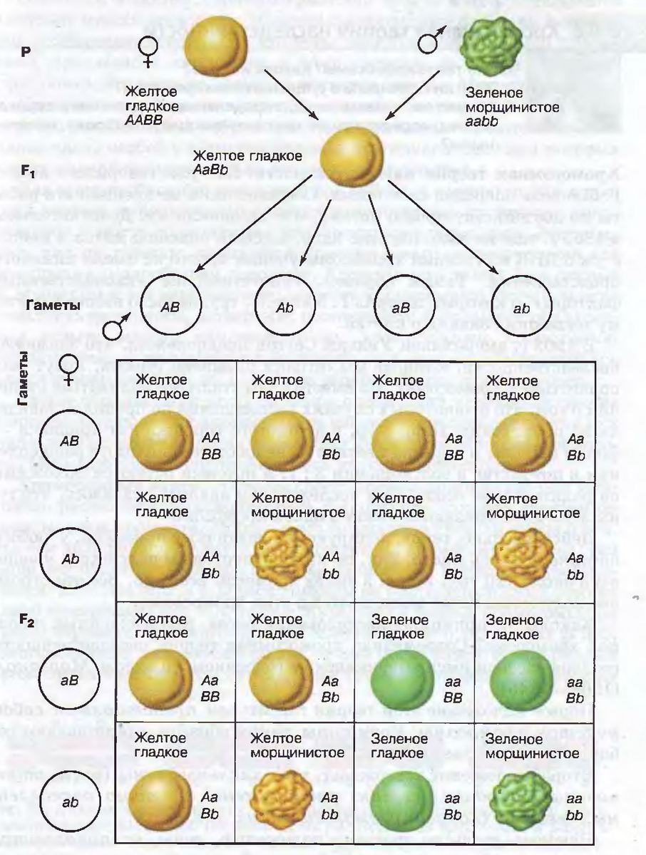дигибридное скрещивание: скрещивание желтого, гладкой формы семя гороха с зеленым морщинестым горохом. Схема на фото