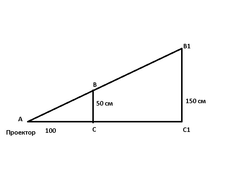 Проектор полностью освещает экран А высотой 50 см, расположенный на расстояние 100 см от проектора. на каком наименьшем расстоянии от проектора нужно расположить экран В высотой 150 см чтобы он полностью был освещен