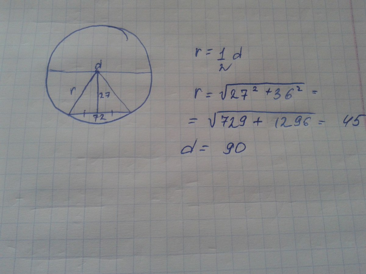 длина хорды окружности равна 72,а расстояние от центра окружности до этой хорды равно 27.найдите диаметр окружности