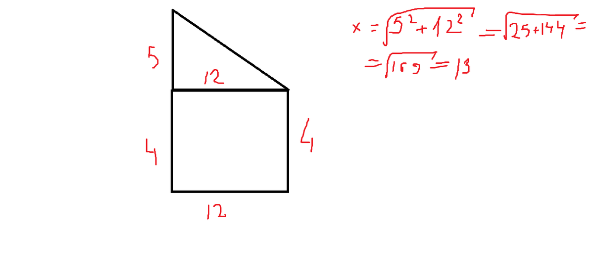 проводишь еще одну высоту, она соответственно равна 12. получается прямоугольный треугольник у которого нужно найти гипотенузу. один катет равен 12, второй 9-4=5. дальше по теореме пифагора. пусть гиппотенуза это Х. тогда Х в квадрате=12 в квадрате+5 в квадрате. Х=13