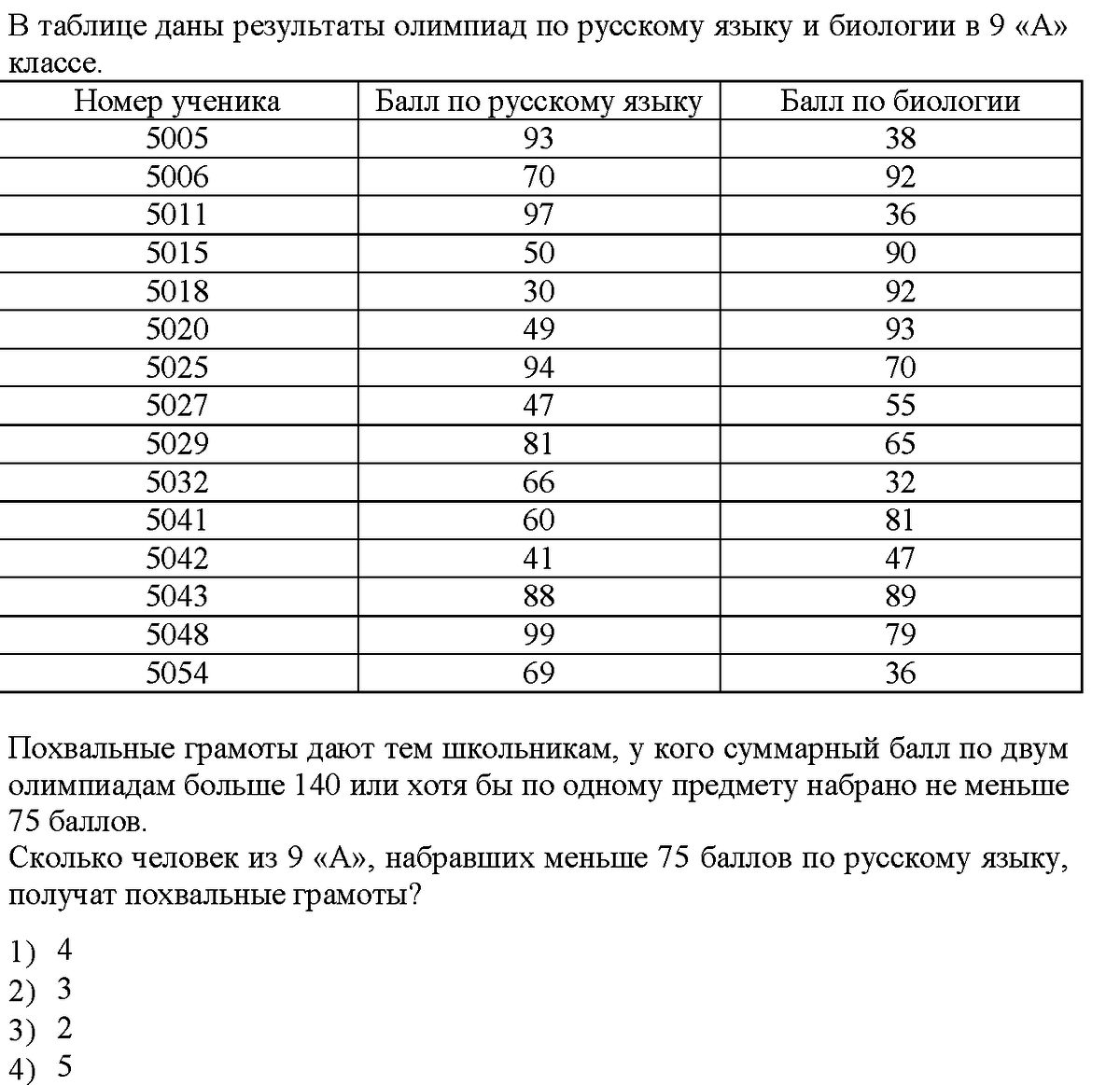 В таблице даны результаты олимпиад по русскому языку и биологии в 9 А классе.