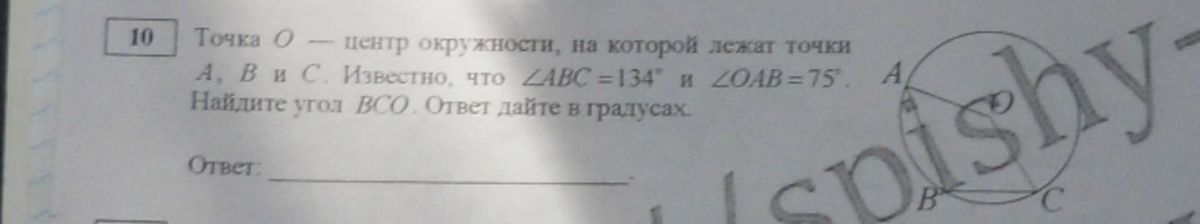 Точка О -центр окружности, на которой лежат точки А, В и С. Известно, что угол ABC=134 градуса и угол ОАВ=75 градусов. Найдите угол ВСО. Ответ дайте в градусах.