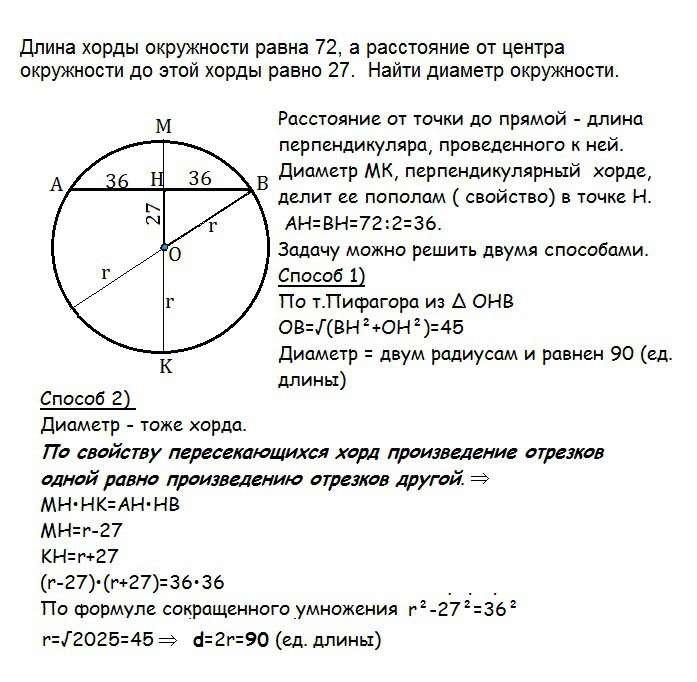 Длина хорды окружности равна 72 а расстоЯние от центра окружности до этой хорды равно 27 найти диаметр окружности
