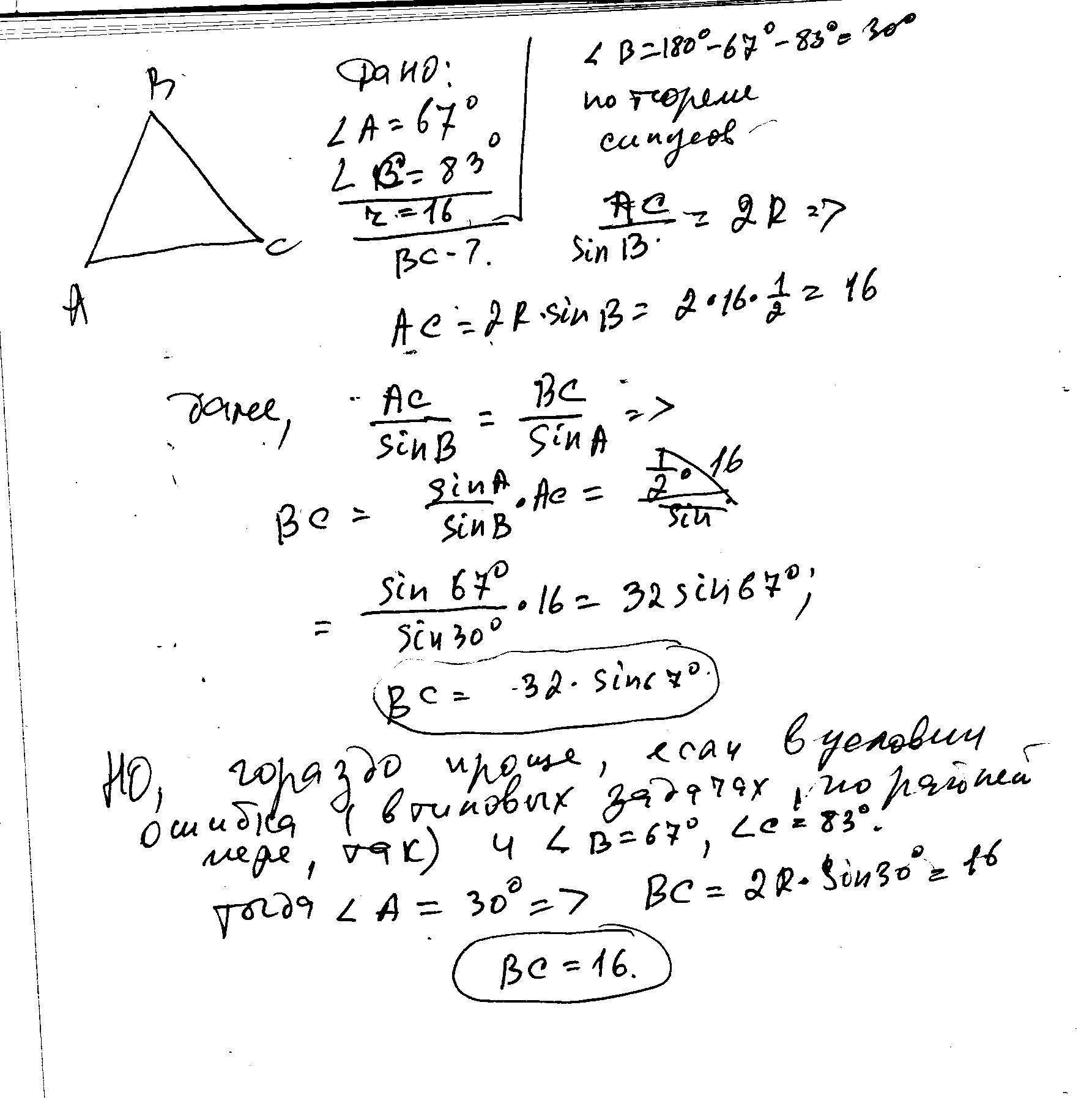 Углы A и C треугольника ABC соответственно 67 и 83 градусов.Найдите BC,если радиус окружности,описанной около треугольника ABC,равен 16.