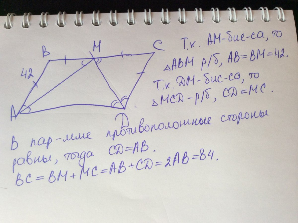 биссектрисы углов а и д параллелограмма авсд пересекаются в точке лежащей на стороне бс.Найдите бс если аб равно 42