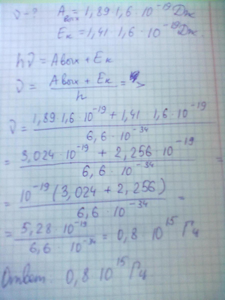 при какой частоте света падающего на металл с работой выхода 1,89 эВ ФОТОЭЛЕКТРОНЫ ПОЛУЧАЮТ КИНЕТИЧЕСКУЮ ЭНЕРГИЮ 1,41 Эв