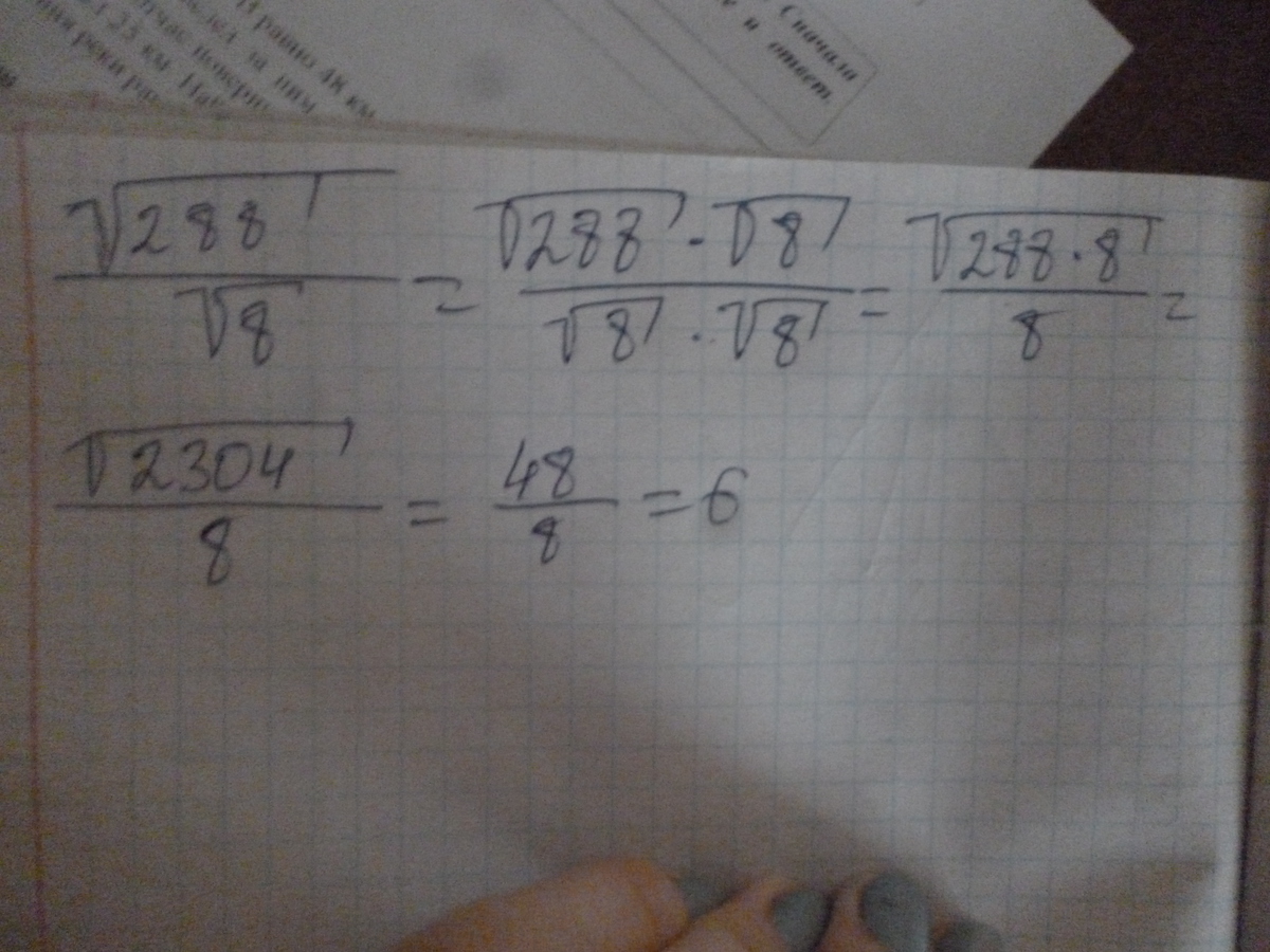 Корень из (288)/корень из (8)=корень из (2*144)/корень из (4*2)=12кореней из (2)/ 2 корня из(2)=6