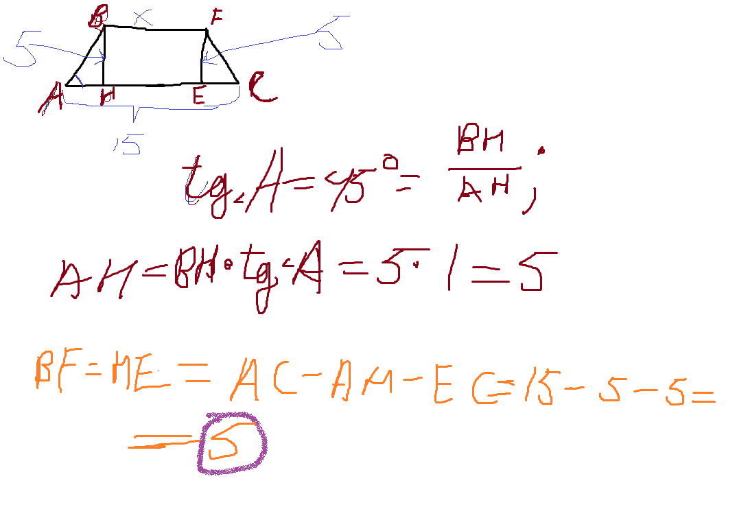 Так как угол 45 гр то треугольник образованный высотой и стороной трапеции равнобедренный и высота делит основание на два отрезка равные 5 и 10,с другой стороной трапеции так же делаешь( проводишь высоту и тд) следовательно меньшее основание равно 5