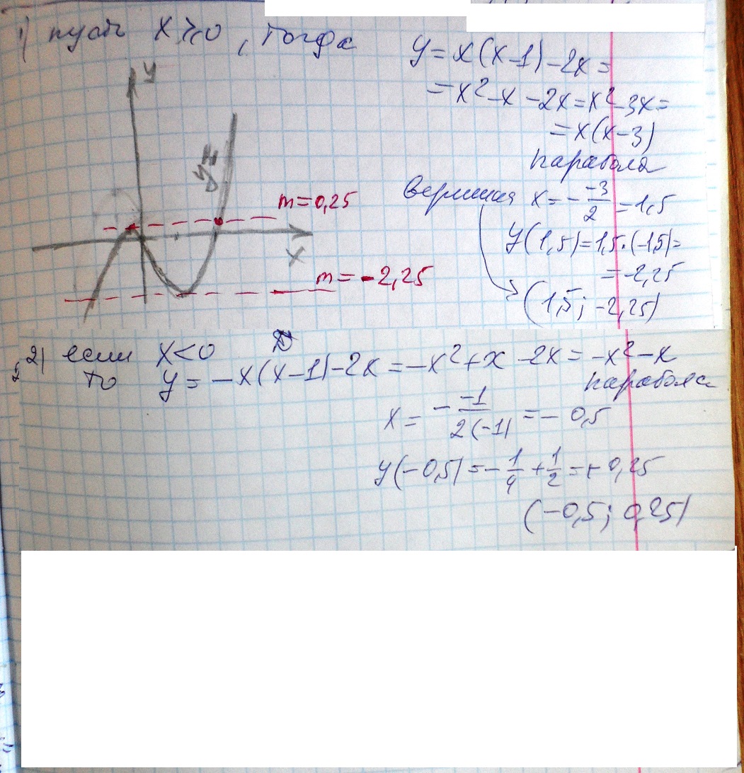 постройте график функции y=|x|(x-1)-2x и определите при каких значениях m прямая y=m имеет с графиком ровно две общие точки.