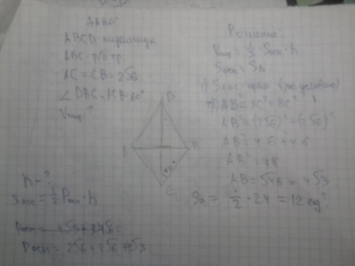 Основание пирамиды равнобедренный прямоугольный треугольник с катетами 2корень из 6. Боковые ребра наклонены к площади основания под углом 60 градусов. Найти объем пирамиды.