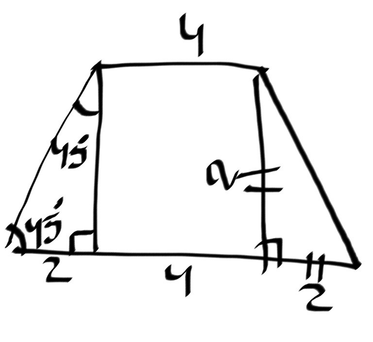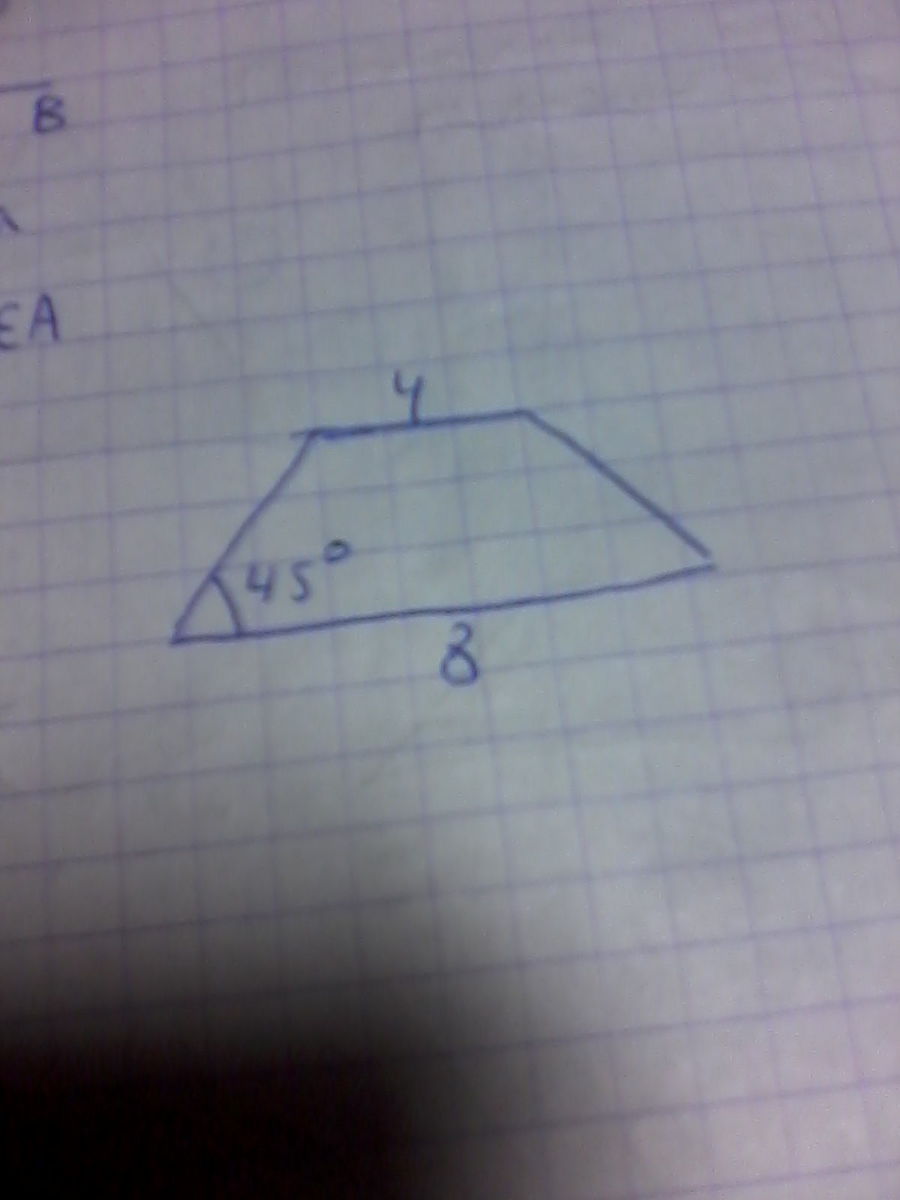 2) проведем высоту к большому основанию, где угол равен 45 градусам. У нас получается угол в 90 градусов, а так как второй угол 45, то и третий угол будет равен 45 градусам, а именно будет равнобедренный, где стороны буду равны двум. Почему двум? можем найти длину отрезанную нашей высотой от основания, которая равна полуразности оснований (8-4)/2 = 2.