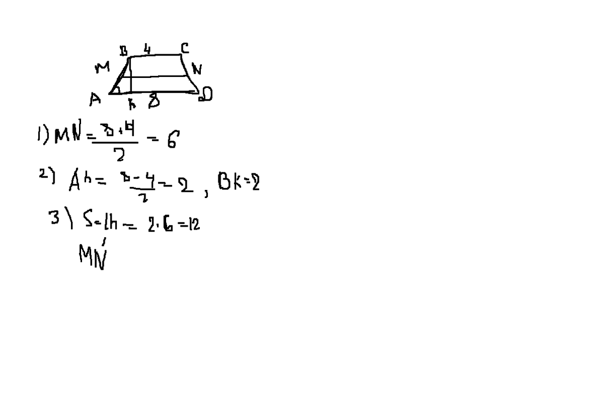 1) Итак, для начала найдем среднюю линию, а именно (8+4)/2 = 6 ( она равна полусумме оснований).