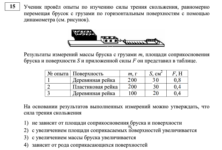 Ученик провёл опыты по изучению силы трения скольжения, равномерно перемещая брусок с грузами по горизонтальным поверхностям с помощью динамометра (см. рисунок)