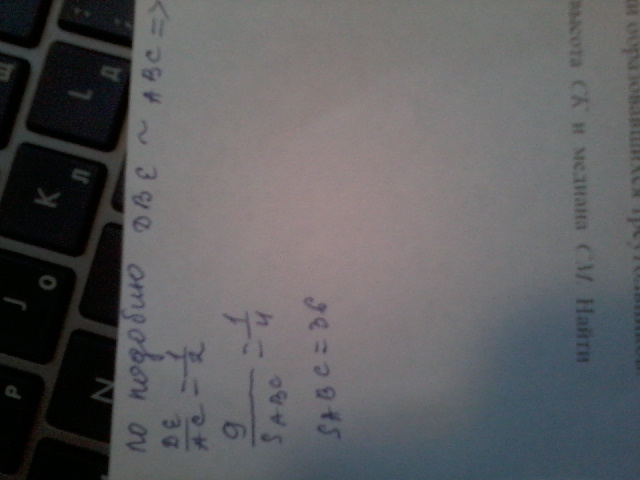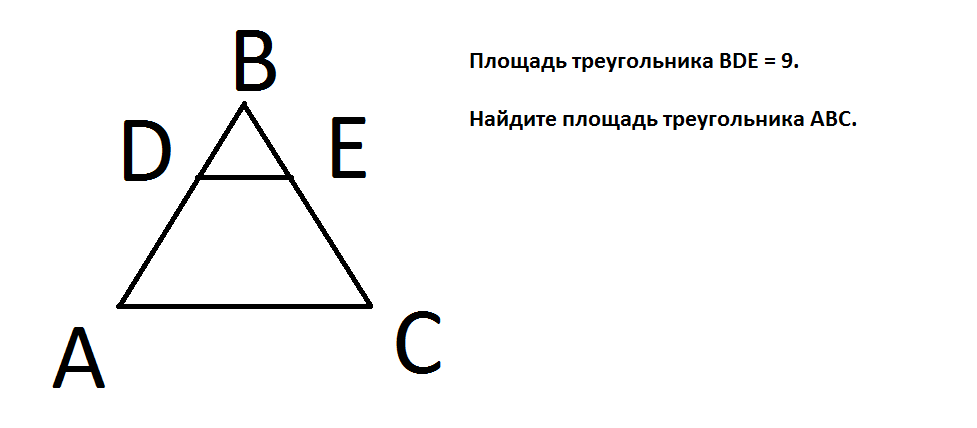 Площадь отсечённого треугольника равна 1/4 части основного треуг.,тогда площадь основного треу. равна 9*4=36 см2