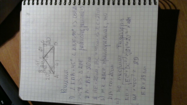 на стороне BC прямоугольника ABCD, у которого AB=20 и AD=41, отмечена точка Е так,что угол ЕАВ=45. Найдите ED
