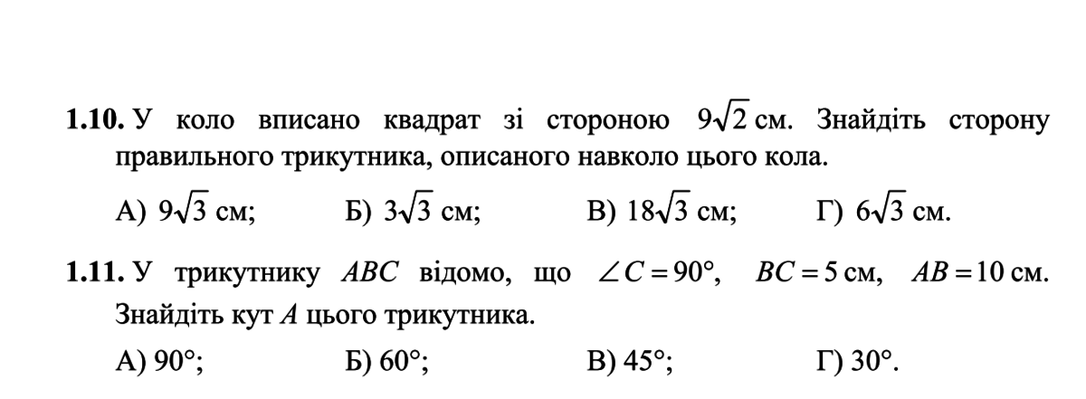 1.10 Диаметр окружности совпадает с диагональю квадрата. Диагональ квадрата равна 9sqrt(2) * sqrt(2) = 18, тогда радиус окружности 18 / 2 = 9.