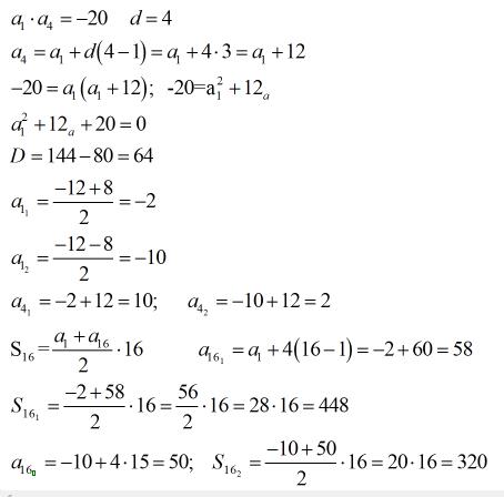 Произведение первого и четвёртого членов арифметической прогрессии равно -20,а разность прогрессии равна 4.Найдите сумму первых шестнадцати членов этой прогрессии.