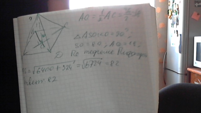 в правильной четырехугольной пирамиде sabcd точка о-центр основания s-вершина,SО=80,AC=36. Найдите боковые рёбра SA.