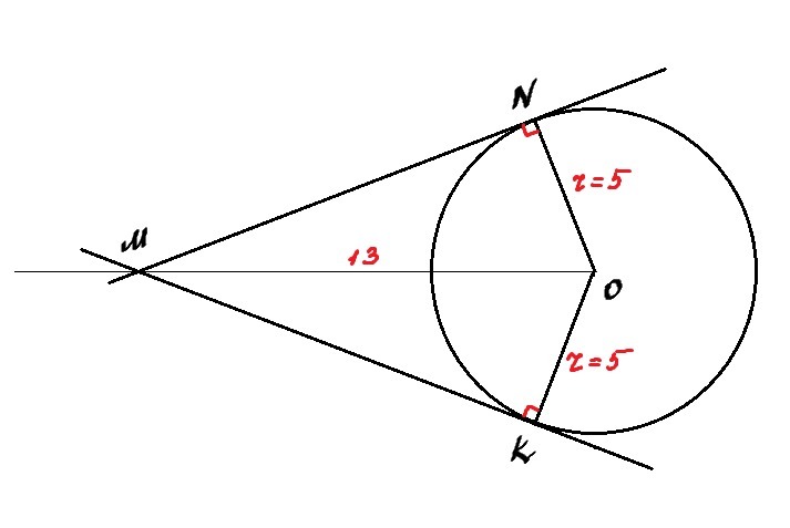 Дано: МN, МК – отрезки касательных, проведенных к окружности, r=5 см, МО=13 см