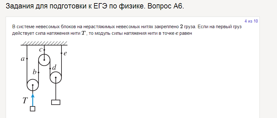 в первой задаче главную роль играет условие нерастяжимости нити. сумма сил, действующих на нить должна быть равна 0. Значит в точке a и b силы натяжения равны, по второму закону ньютона T/2. Так же в точках b и d они тоже равны T/2. в точке e сила натяжения должна быть равна силе натяжения в точке d, чтобы система была уравновешена. Отсюда ответ T/2