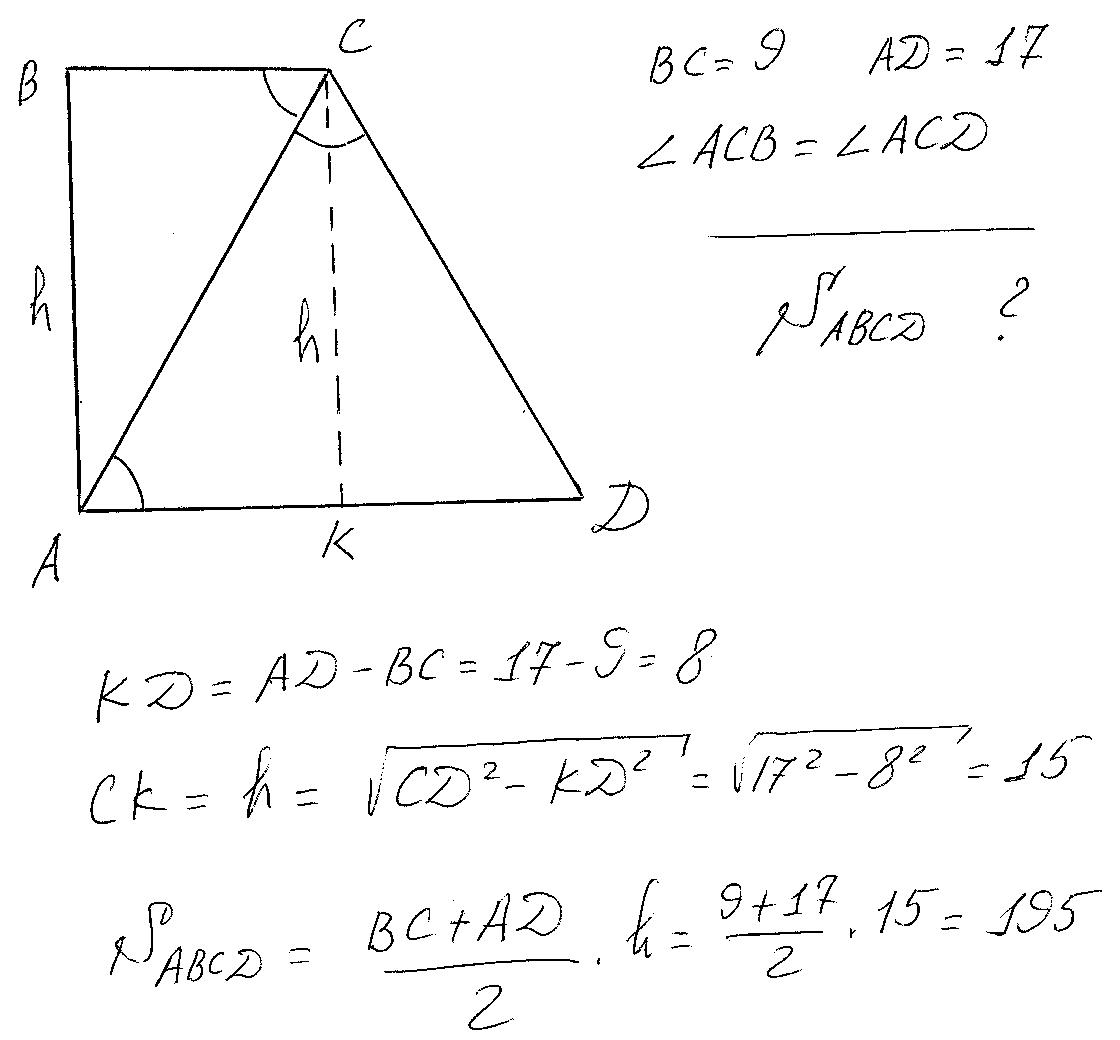 Углы ВСА и САВ равны как накрест лежащие(смотри рисунок). Но уголы ВСА и ДСА равны по условию. Тогда равны и углы АСД и САД. То есть треугольник САД равнобедренный, и СД =АД=17. По теореме Пифагора находим h. Окончательный ответ Sавсд=195.