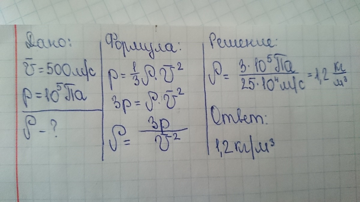Какова плотность ρ идеального газа, у которого средняя квадратичная скорость хаотического движения молекул равна 500 м/с при давлении 1∙〖10〗^5 Па?