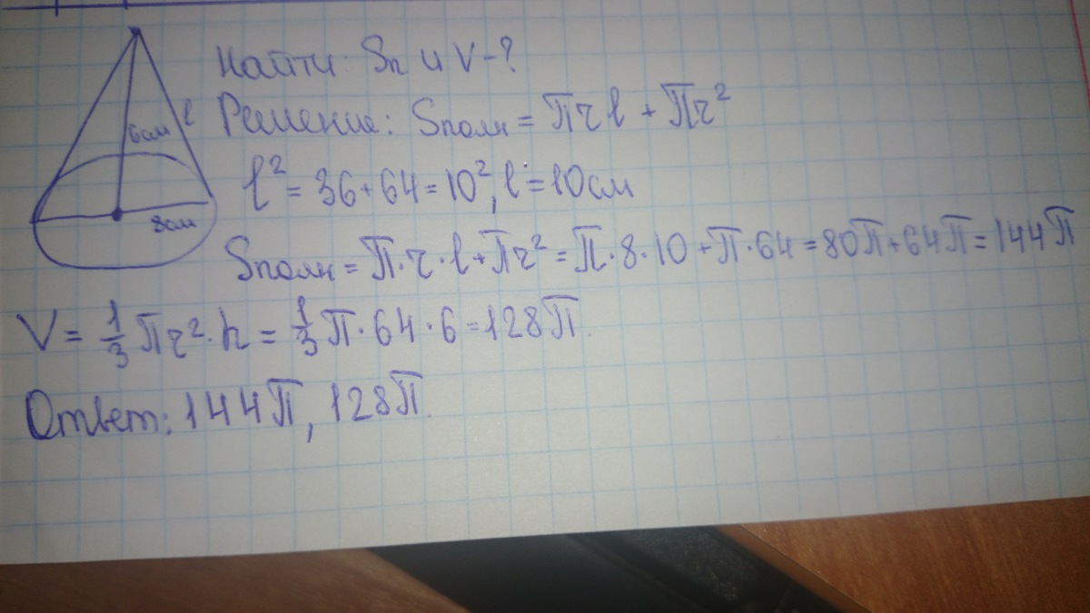 Радиус основания конуса равен 8см а его высота 6см. Найти объем и площадь полной поверхности конуса.
