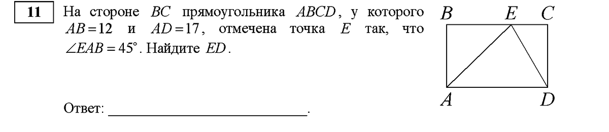 Угол АЕВ в треугольнике АВЕ равен 45 град. Треуг АВЕ- равнобедренный. АВ=ВЕ=12 см. Тогда ЕС= 17-12=5см. СД у нас 12 см (тк прямоугольник). Найдем СД по теор Пифагора- 5 в квадрате+ 12 в квадрате= 169. Вытаскиваем 169 из квадрата=13 см. Ответ ЕД=13 см