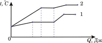На рисунке представлен график зависимости температуры от полученного количества теплоты для образцов равной массы из двух разных веществ. Первоначально каждое из веществ находилось в твёрдом состоянии. Сравните значения температуры плавления t и удельной теплоёмкости с для веществ в твёрдом состоянии.
