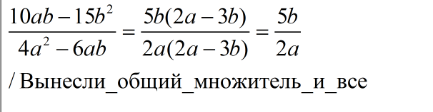 Находим общий множитель, в числителе ( тот что сверху) мы видим везде множитель b, а так же можно заметить что у 10 и 15 общий множитель 5, значит полный общий множитель равен 5b, вынесли за скобки и оставляем что осталось, в знаменателе ( что снизу) видим общий множитель a, 4 и 6 так же имеют общий множитель это 2, выносим этот общий множитель 2a за скобки, оставляем в скобках что осталось. Проверим - 2a*a даст 2a^2 да плюс 2a*-3b даст -6ab .Потом видим что у нас совпали 2 множителя (2a-3b) можно просто сократить, тоже самое что 2 * 4-2 / 5 * 4-2 = 4/10 = 0.4 а если 4-2 уберем получим 2/5 что так же даст ответ 0.4 поэтому просто сокращаем этот множитель, обычно в таких уравнениях присутствуют формулы сокращенного умножения типа a^2-b^2 просто главное научиться их находить и расписывать как они есть, например a^2-64 = можно представить как (a+8)(a-8). Удачи.