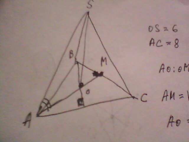 Помогите, пожалуйста!!!Высота правильной треугольной пирамиды SABC и сторона основания равны 6 и 8 соответственно. Найдите тангенс угла между боковым ребром и плоскостью основания пирамиды.