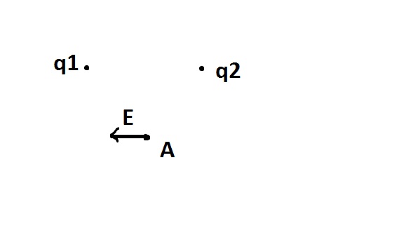 Даны два заряда и точка А, из которой направлен вектор напряженности. Выберите верное утверждение: