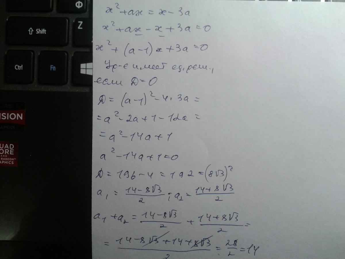 Найти сумму всех значений параметра а, при которых уравнение х^2+ах=х-3а имеет единственное решение.