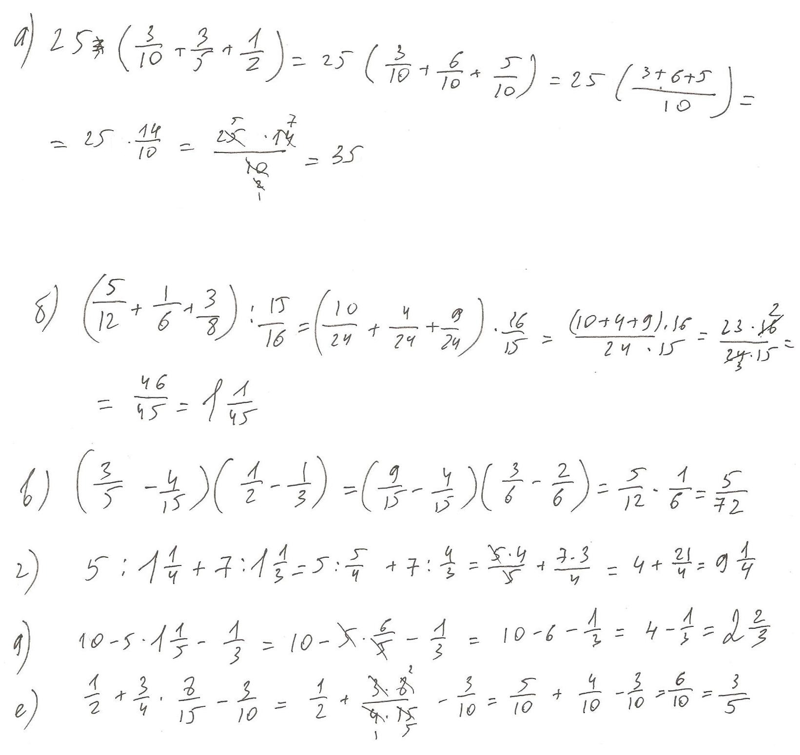 (Это Дроби)Найдите значение выражений(нужно расписать решение) а)25х(3/10+3/5+1/2)= б)(5/12+1/6+3/8):15/16= в)(3/5-4/15)х(1/2-1/3)= г)5:Одну целую одну четвёртую+7:Одну целую одну третью= д)10-5хОдну целую одну пятую-1/3= е)1/2+3/4х8/15-3/10= помогите!