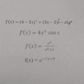 Найти производную функции e^(-7x+9) и (4-3x)^7+(3x-2)^(1/2)-ctg((x)^x), но надо с решением