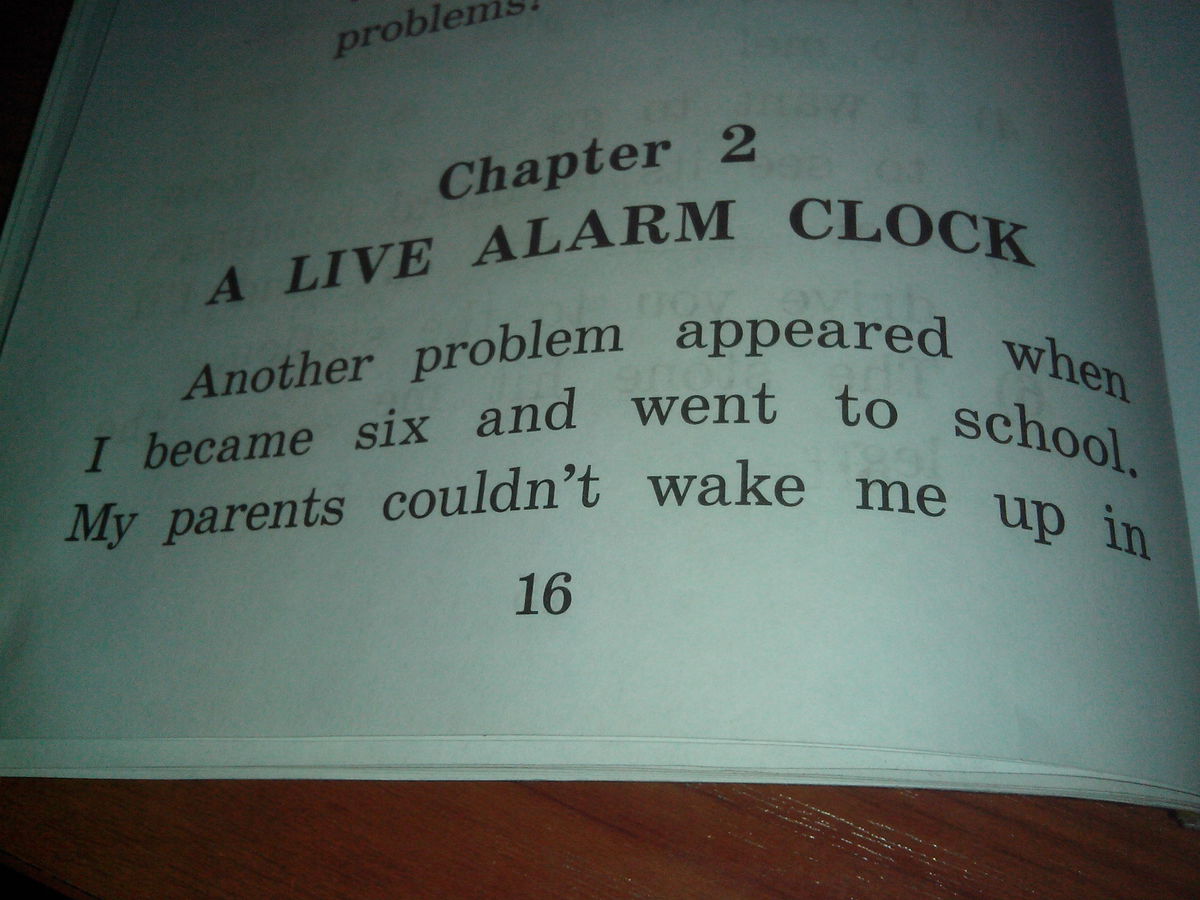 Мои родители не знали, что делать, поэтому они купили специальный будильник. Когда на часах было 7, будильник сначала громко издавал звук, потом стал лаять как большая собака. Я не вставал и выключил его, он стал петь.