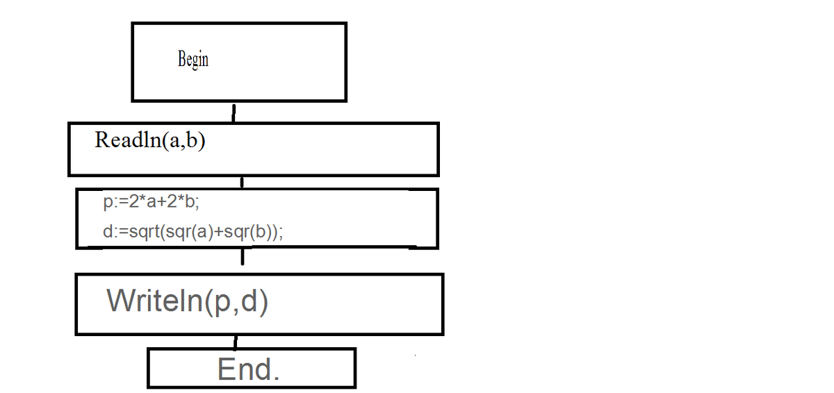 Составить алгоритм вычисления периметра прямоугольника и его диагонали, если известны его стороны.