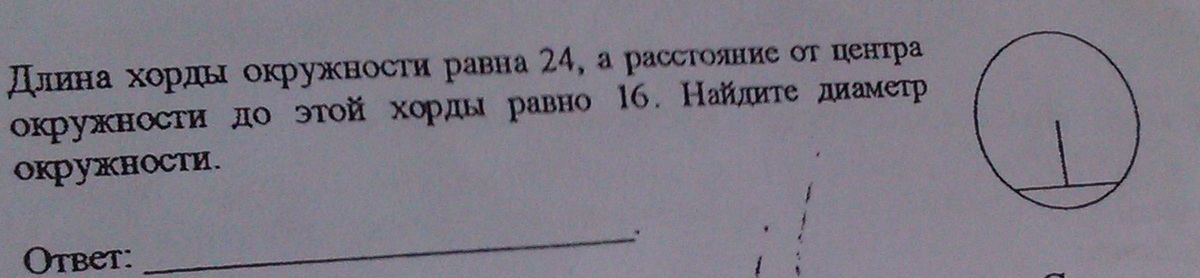 Проведем от центра до конца хорды отрезок, тогда получится прямоугольный треугольник. Отрезок, проведенный от центра, делит на две равные части хорду. В треугольнике известны два катета-16(отрезок от центра), 24:2=12-половина хорды.