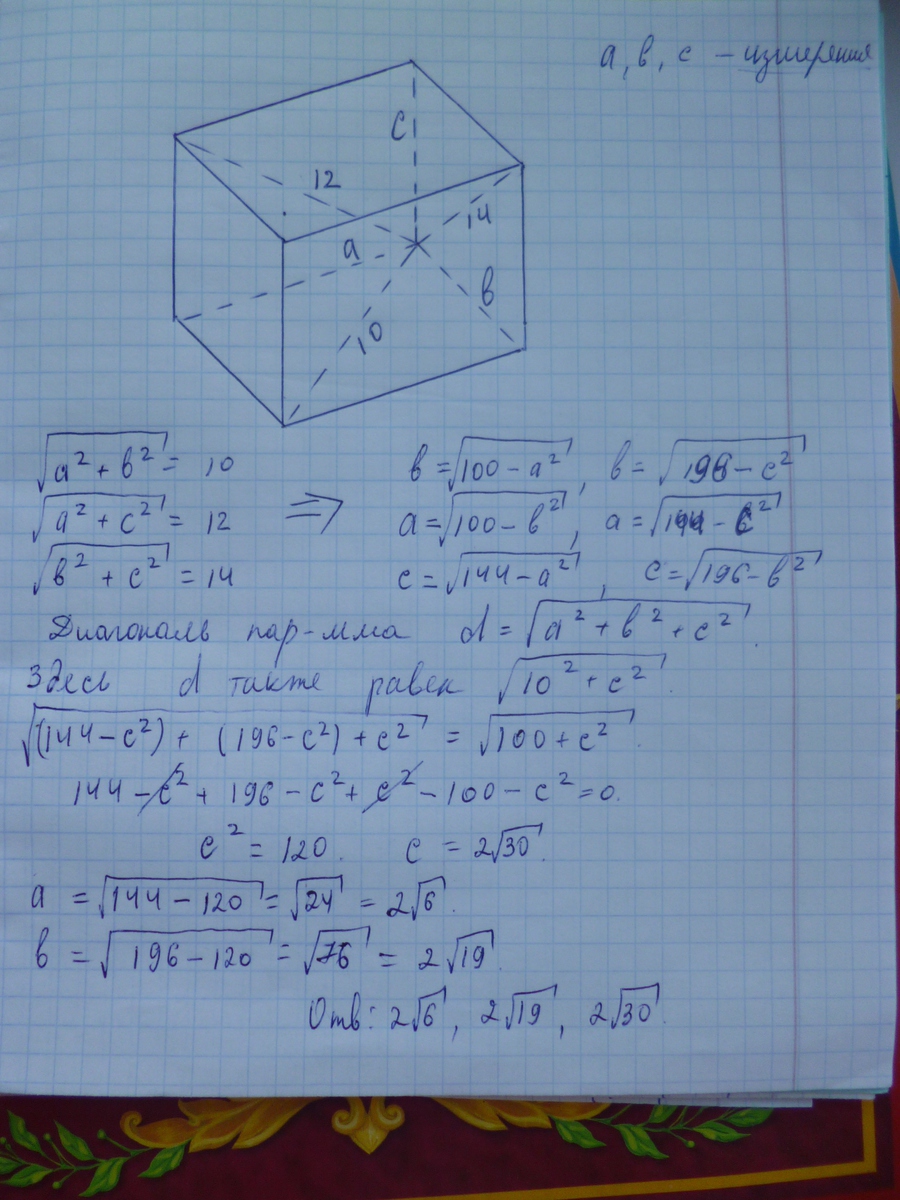 Диагонали трех граней прямоугольного параллелепипеда, сходящиеся в одной вершине, равны 10, 12 и 14 см. Найдите линейные размеры параллелепипеда