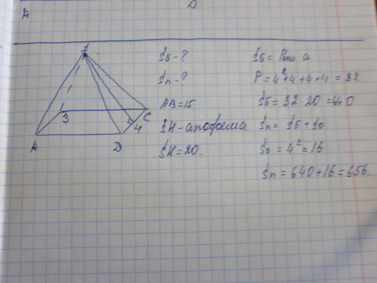 вычислить площади боковой и полной поверхности пирамиды основанием который является правильный четырехугольник с стороной 15 и апофемой 20