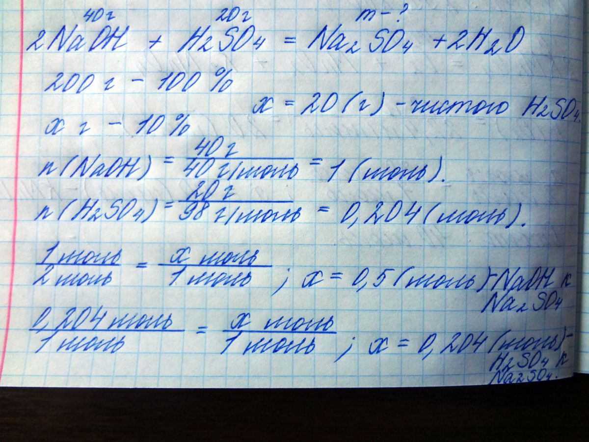 вычислить массу сульфата натрия образованного при нейтрализации 40 г твердой щелочи с 200г раствора 10% серной кислоты