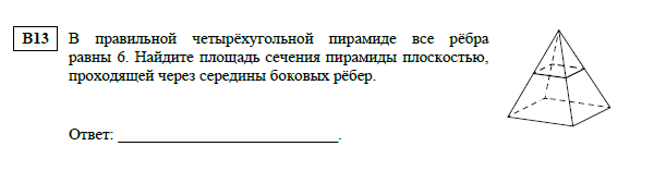 В правильной четырёхугольной пирамиде все рёбра равны 6. Найти площадь сечения пирамиды плоскостью, проходящей через середины боковых рёбер.