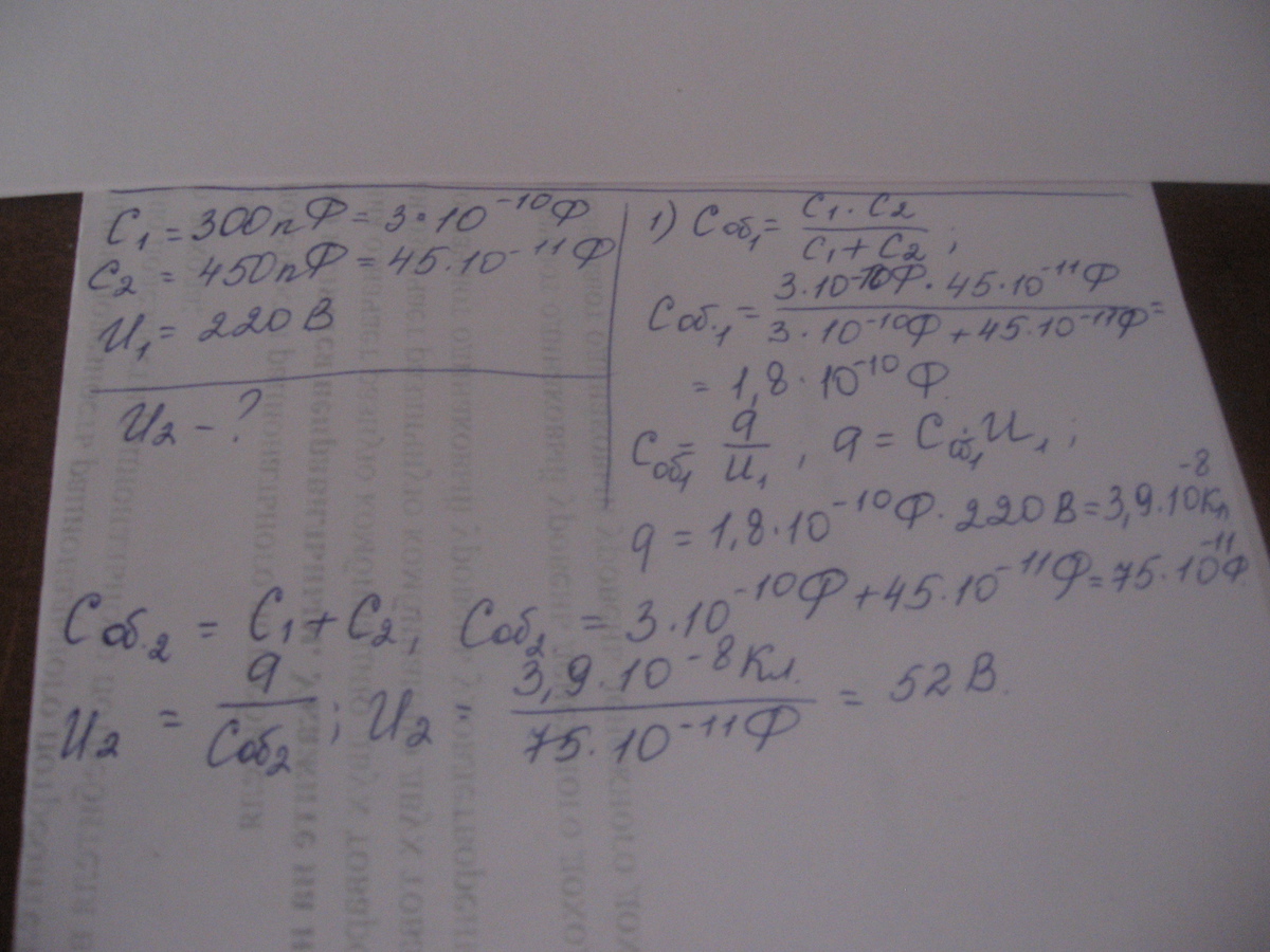 Батарею из двух конденсаторов емкостями 300 пФ и 450 пФ, соединили последовательно, включили в сеть с напряжением 220 В. Потом батарею отключили от сети, и конденсаторы соединили паралельно. Найти напряжение на зажимах полученной батареи конденсаторов.