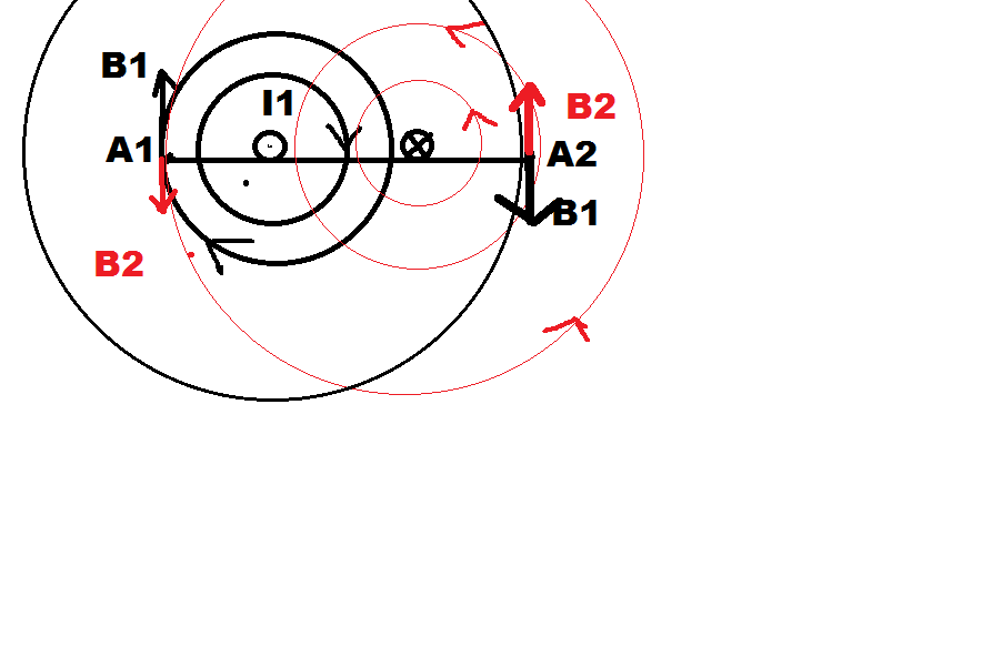 Аналогичным способом проанализируем модуль и направление векторов B обоих проводников в точке A2.