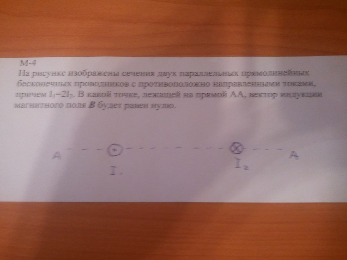 В точке А направление B проводника I1 указывает вверх. В этой же точке B2 проводника I2 направлен вниз. Т.к. I1>I2 в два раза и I 2 находится от этой точке в два раза дальше=> что вектор индукции магнитного поля I1 в этой точке будет в 4 раза больше B2.